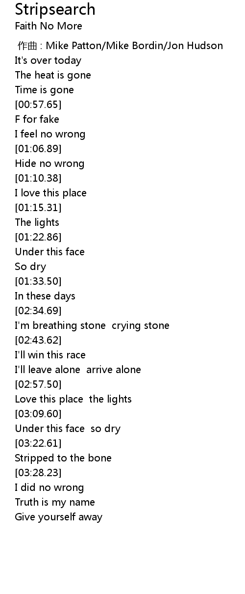 | [00:00.00] | 作曲 : Mike Patton/Mike Bordin/Jon Hudson |