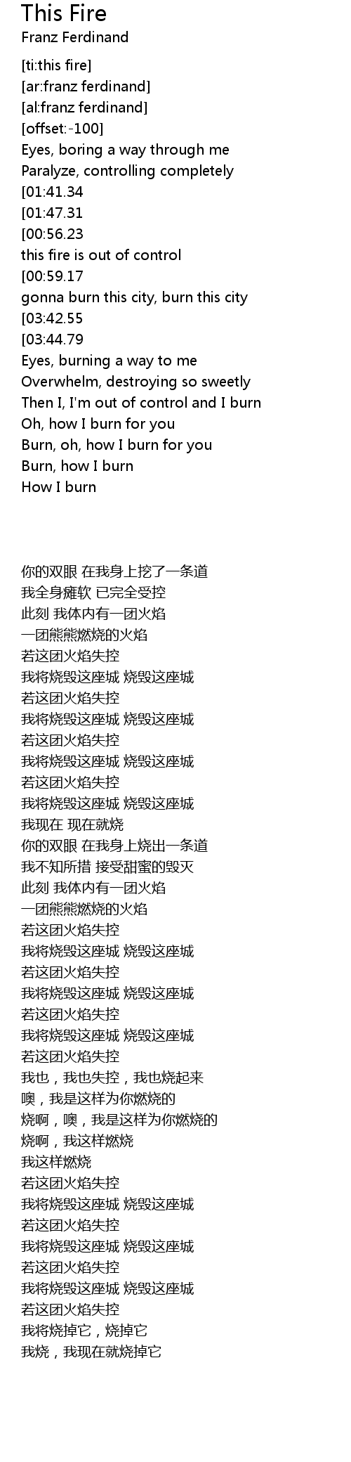 | [00:51.85][00:59.17][01:05.81][01:58.15][02:05.19][02:12.20][03:21.48][03:28.46][03:35.36] | I'm gonna burn this city, burn this city |