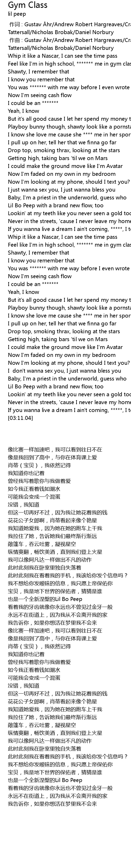 | [02:09.30] | Feel like I'm in high school, ******* me in gym class |