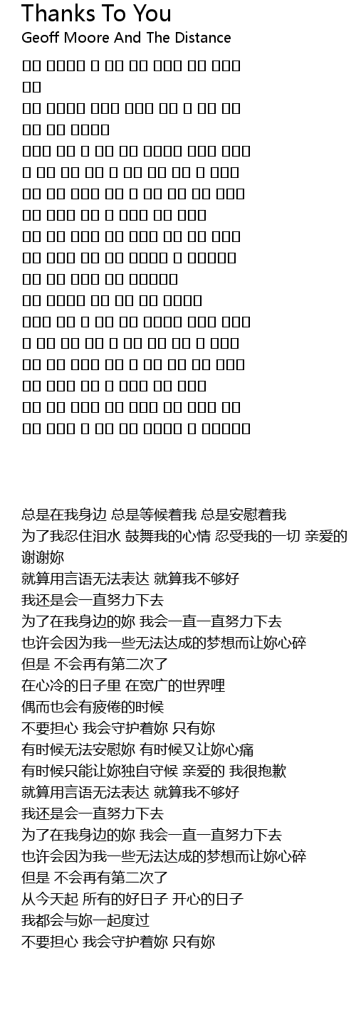 | [00:21.090] | 为了我忍住泪水 鼓舞我的心情 忍受我的一切 亲爱的 谢谢妳 |