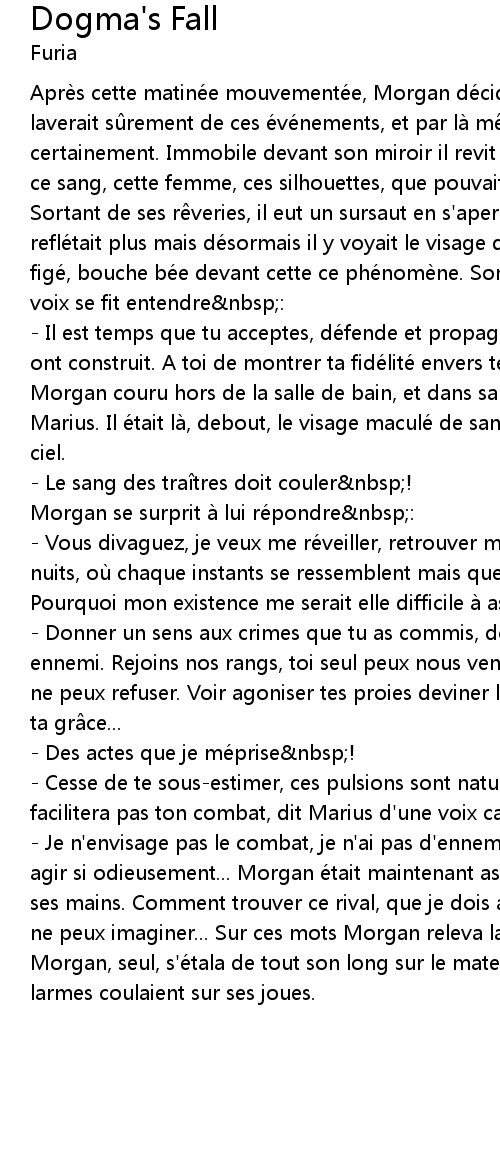| Je n' envisage pas le combat, je n' ai pas d' ennemi, rien en moi ne me pousse a agir si odieusement... Morgan e tait maintenant assis sur son lit la t te entre ses mains. Comment trouver ce rival, que je dois affronter, une parente que je ne peux imaginer... Sur ces mots Morgan releva la t te, Marius avait disparu. | |