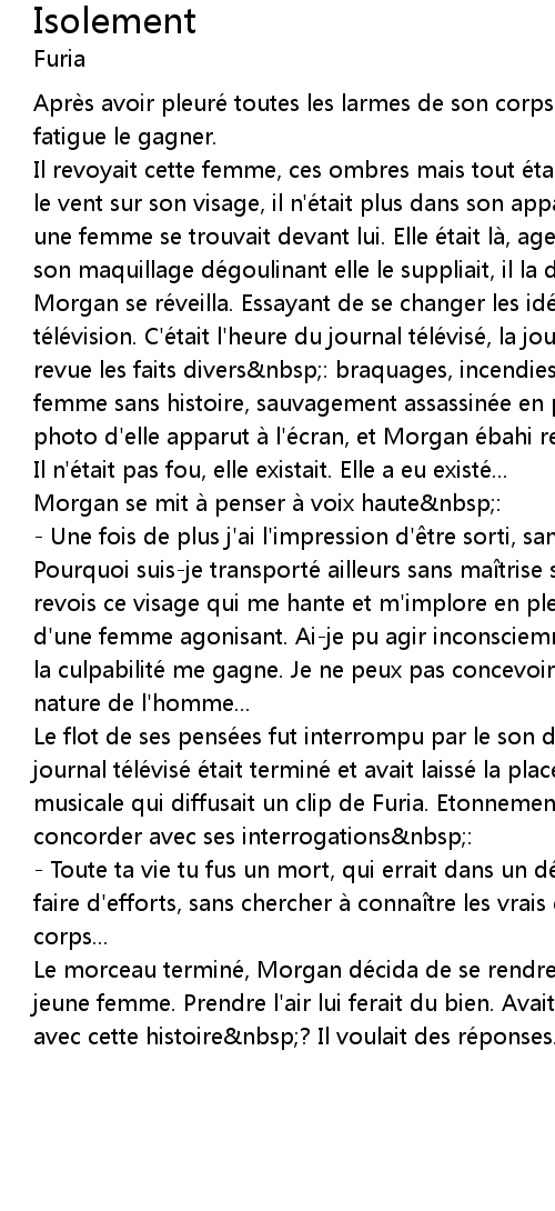Le flot de ses pensé es fut interrompu par le son de son té lé viseur, le journal té lé visé é tait terminé et avait laissé la place à une é mission musicale qui diffusait un clip de Furia. Etonnement les paroles semblaient concorder avec ses interrogations nbsp: