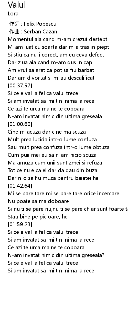 | [02:00.94] | Si ce e val la fel ca valul trece |