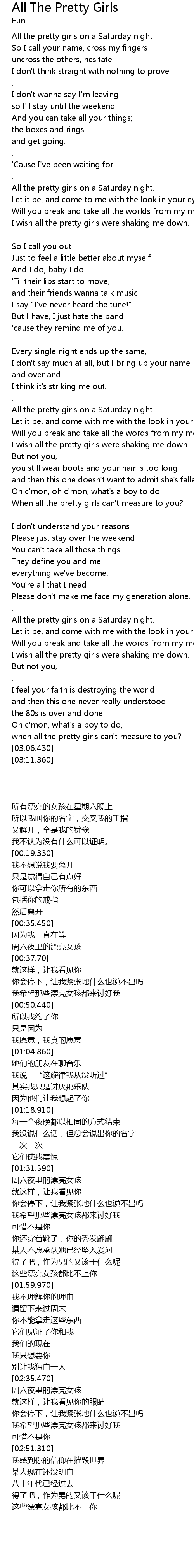 | [01:31.970] | All the pretty girls on a Saturday night |