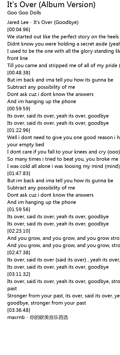 | [03:00.04] | Its over, said its over, yeah its over, goodbye |