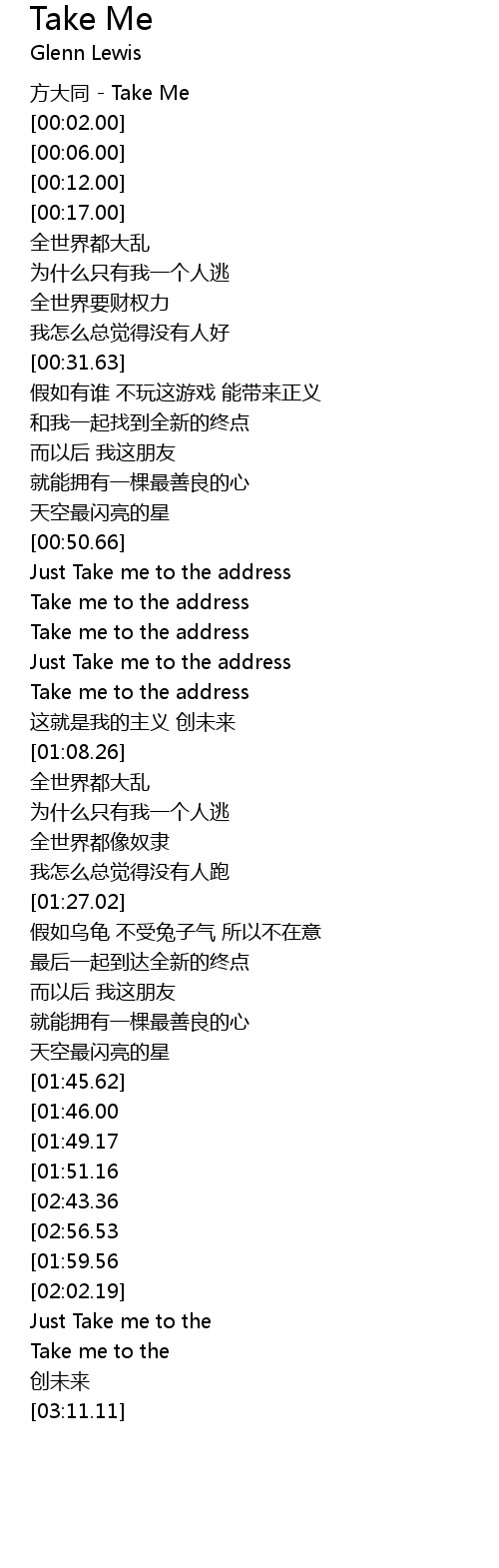 | [02:54.12][02:43.36][01:54.96] | Just Take me to the address |