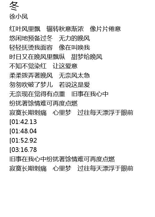 | [02:59.62][01:42.13] | 残叶风里飘 辗转秋意更浓 |