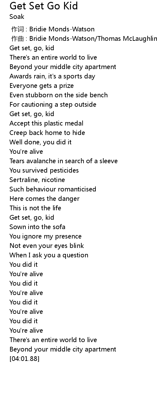 | [01:57.85] | Get set, go, kid |
