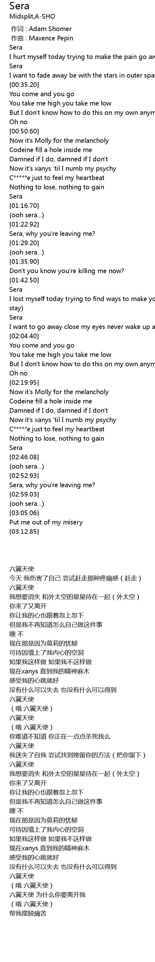 | [02:32.98] | Now it's xanys 'til I numb my psychy |