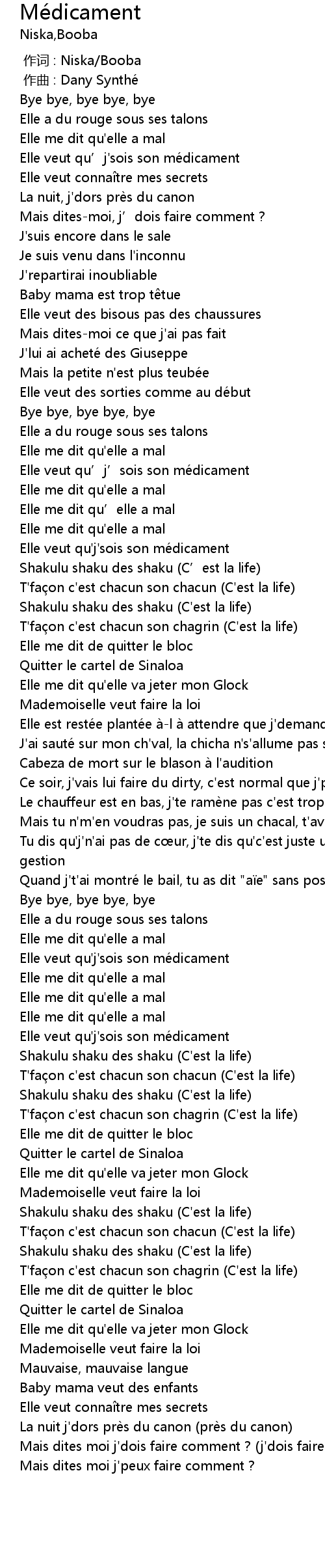 | [00:16.36] | Elle veut qu' j' sois son mé dicament |