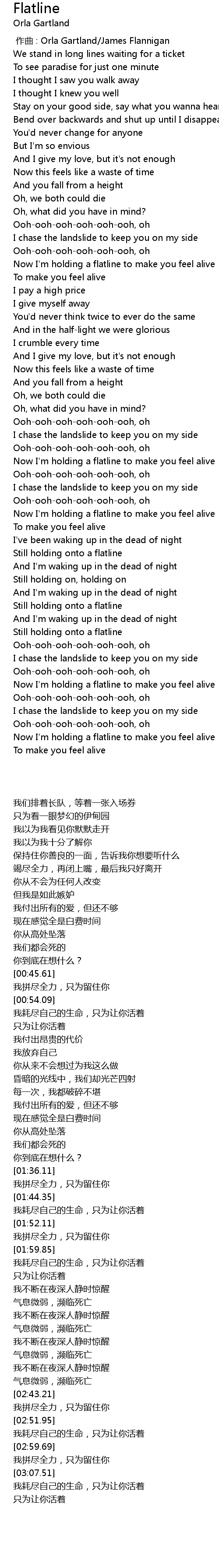 | [00:57.18] | Now I' m holding a flatline to make you feel alive |