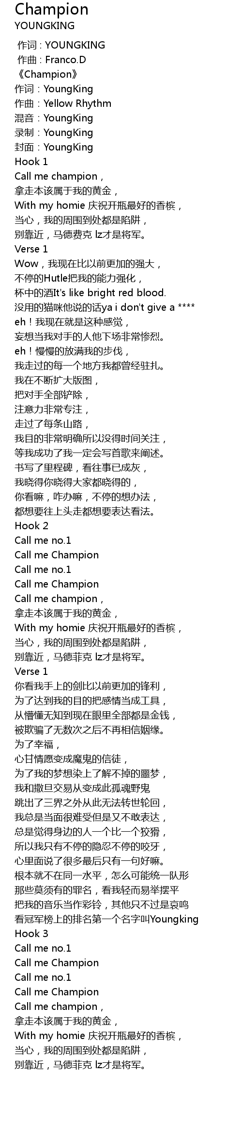 | [02:05.269] | 看冠军榜上的排名第一个名字叫Youngking |