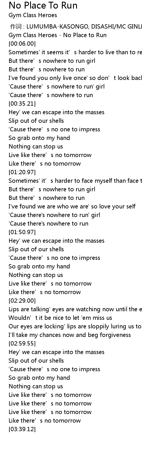 | [00:00.00] | Gym Class Heroes - No Place to Run |