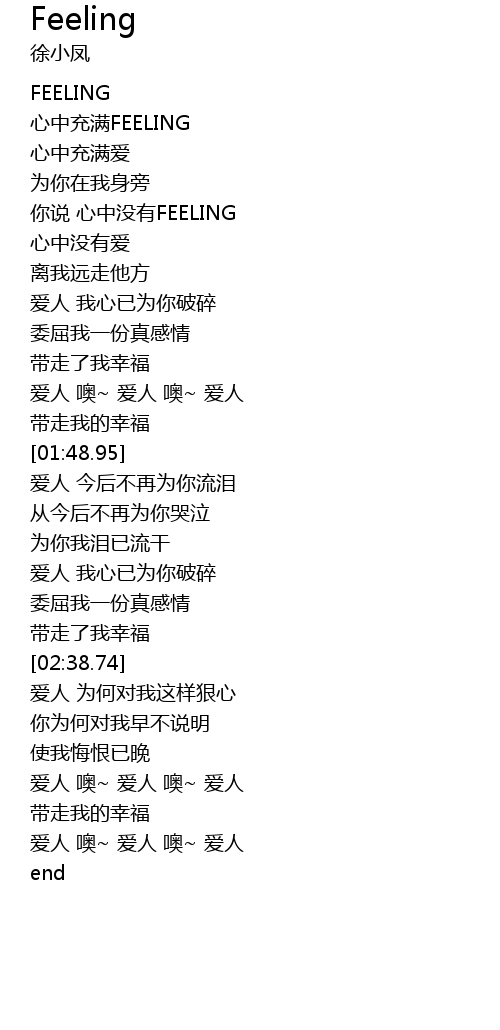 | [00:32.33] | ni shuo xin zhong mei you FEELING |