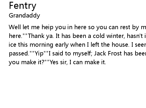 | Well let me heip you in here so you can rest by my fire...so strong cold out here.""Thank ya. It has been a cold winter, hasn't it.""Yip.""Hah... There was ice this morning early when I left the house. I seen it on the ditches as I passed.""Yip""I said to myself; Jack Frost has been here.""He sure has... Can you make it?""Yes sir, I can make it. |