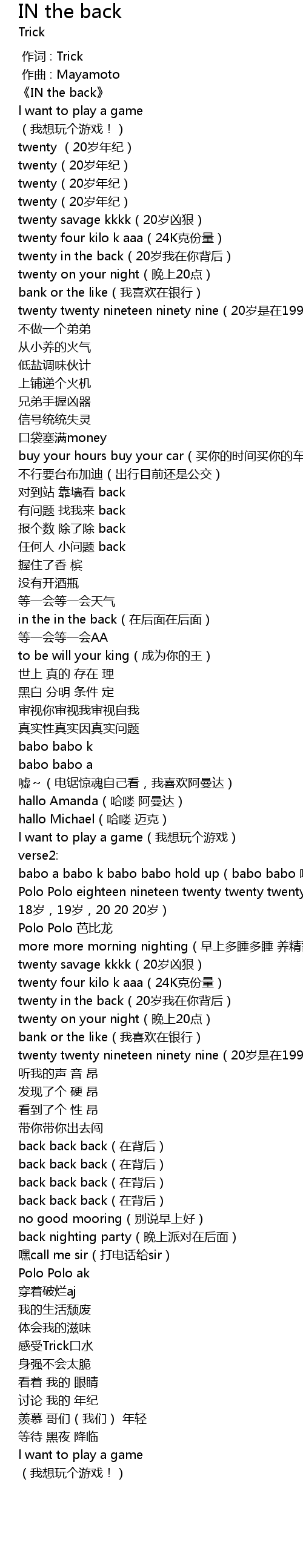 | [00:45.771] | in the in the back zài hòu miàn zài hòu miàn |