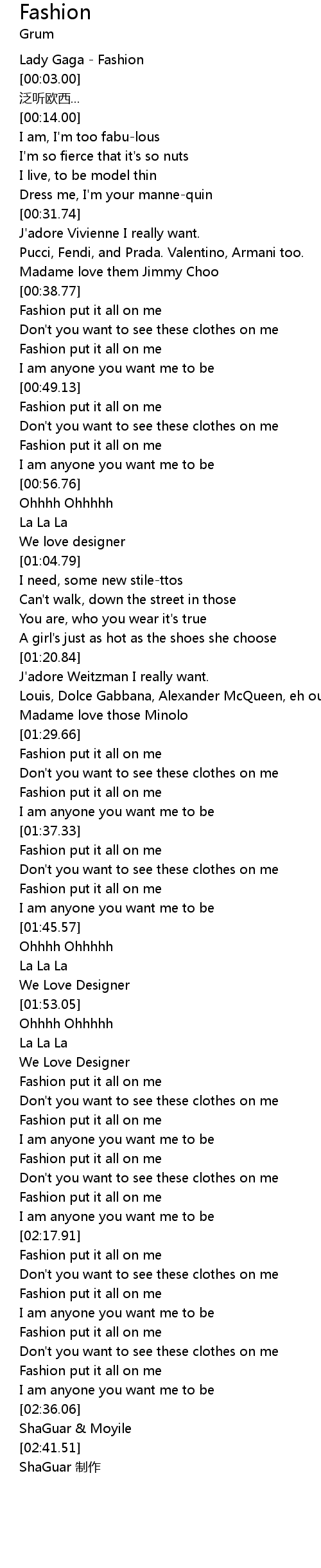 | [00:35.29] | Pucci, Fendi, and Prada. Valentino, Armani too. |