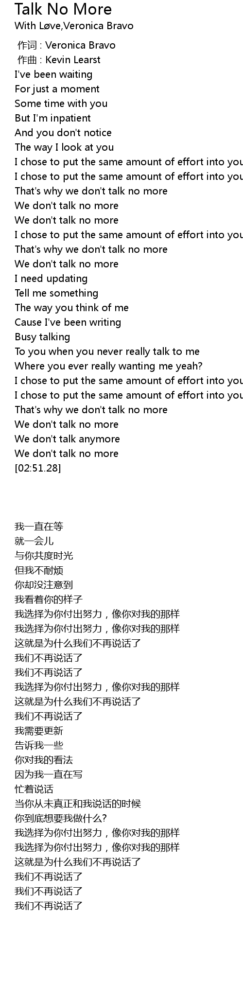 | [00:50.56] | We don' t talk no more |