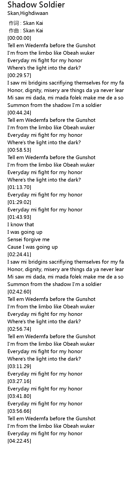 | [00:40.99] | Summon from the shadow I'm a soldier |