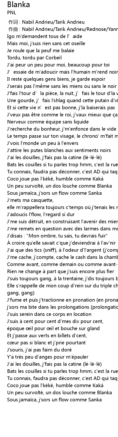 | [01:33.99] | J'attire les putes blanches aux sentiments noirs |