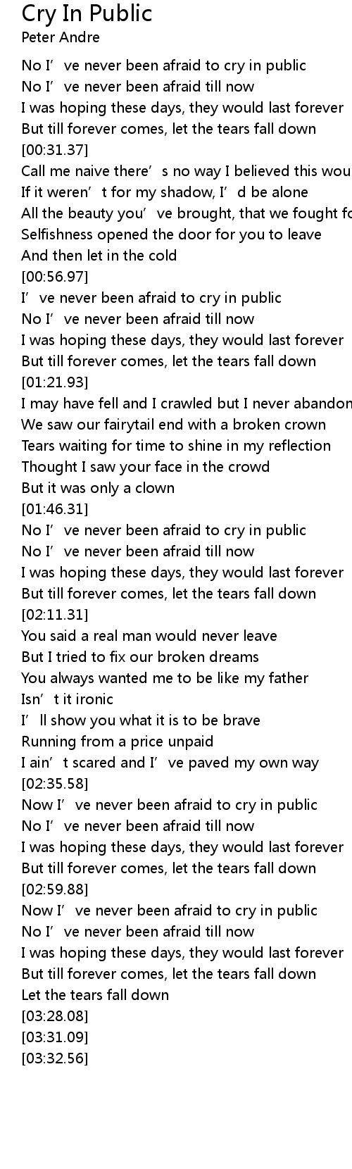 | [00:57.18] | I' ve never been afraid to cry in public |