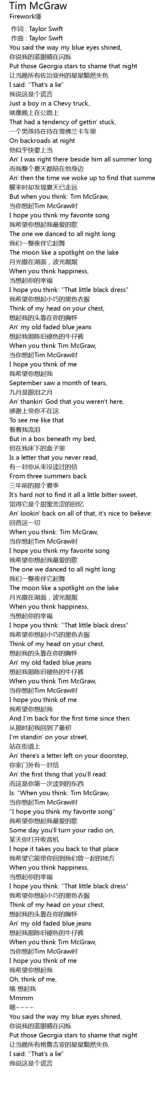 | [00:54.683] | dāng nǐ xiǎng qǐ Tim McGraw shí |