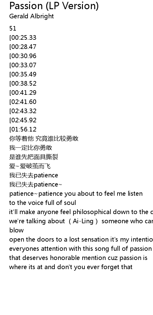 | [02:56.12][02:45.92][01:52.25][01:42.22][01:01.29][00:51.01] | passion nǐ hé wǒ zài bǐ sài |