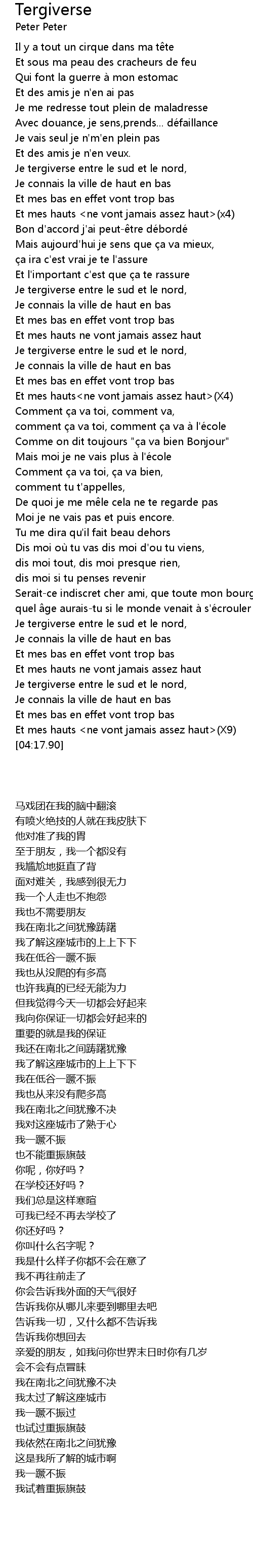 | [01:59.45] | Je tergiverse entre le sud et le nord, |