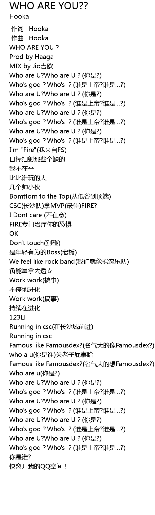 | [00:38.202] | Who are U? Who are U? nǐ shì? |