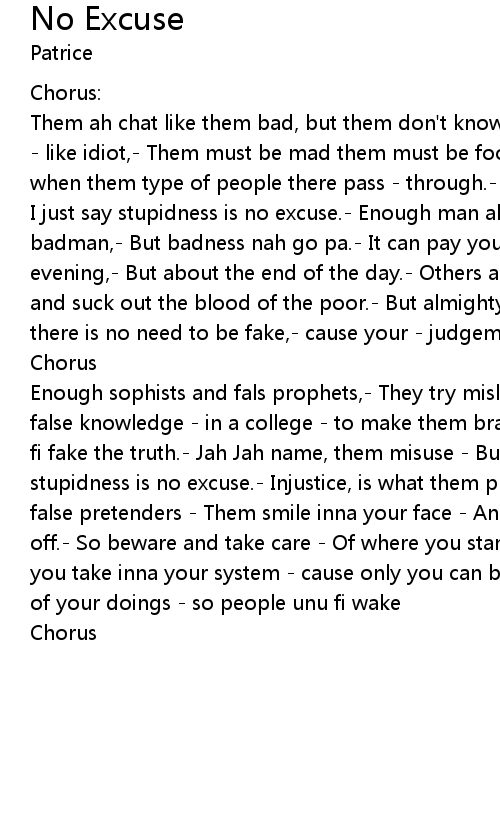 I just say stupidness is no excuse.- Enough man ah gawn like them are bad man?- badman,- But badness nah go pa.- It can pay yout rent in the morning and the evening,- But about the end of the day.- Others ah gawn like them are big man - and suck out the blood of the poor.- But almighty Jah Jah I see everything,- so there is no need to be fake,- cause your - judgement you can't escape. |
