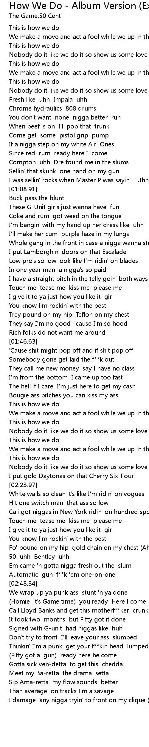 | [01:50.20] | Somebody gone get laid the f**k out |