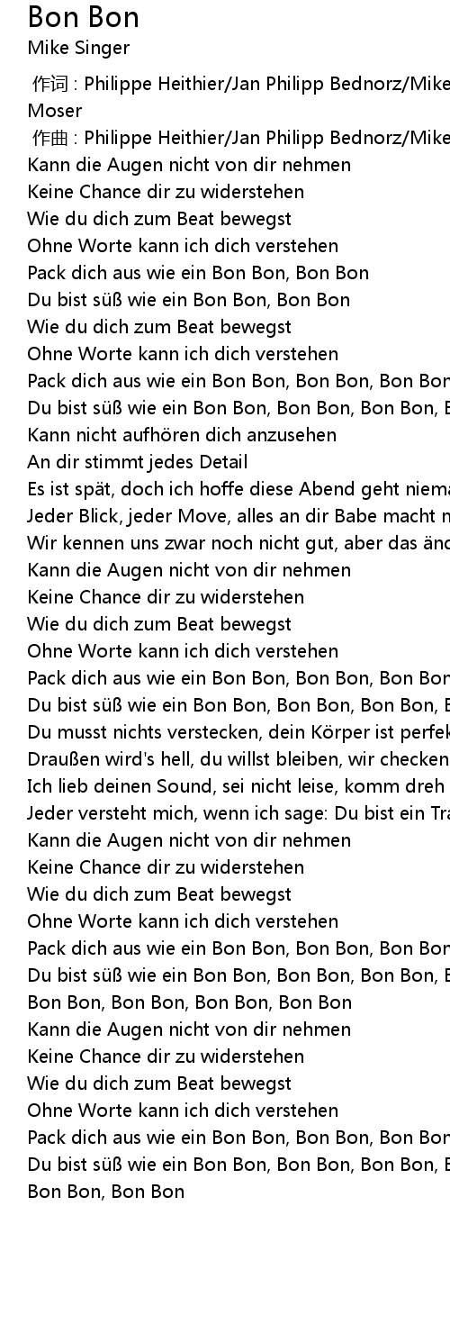 | [00:33.73] | Du bist sü wie ein Bon Bon, Bon Bon, Bon Bon, Bon Bon |