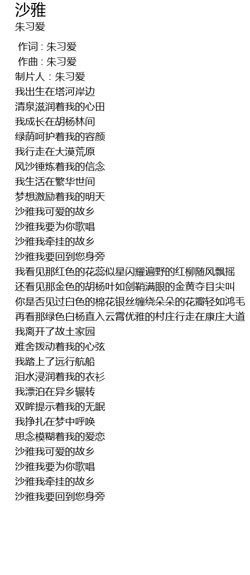 | [03:22.723] | 沙雅我牵挂的故乡 |