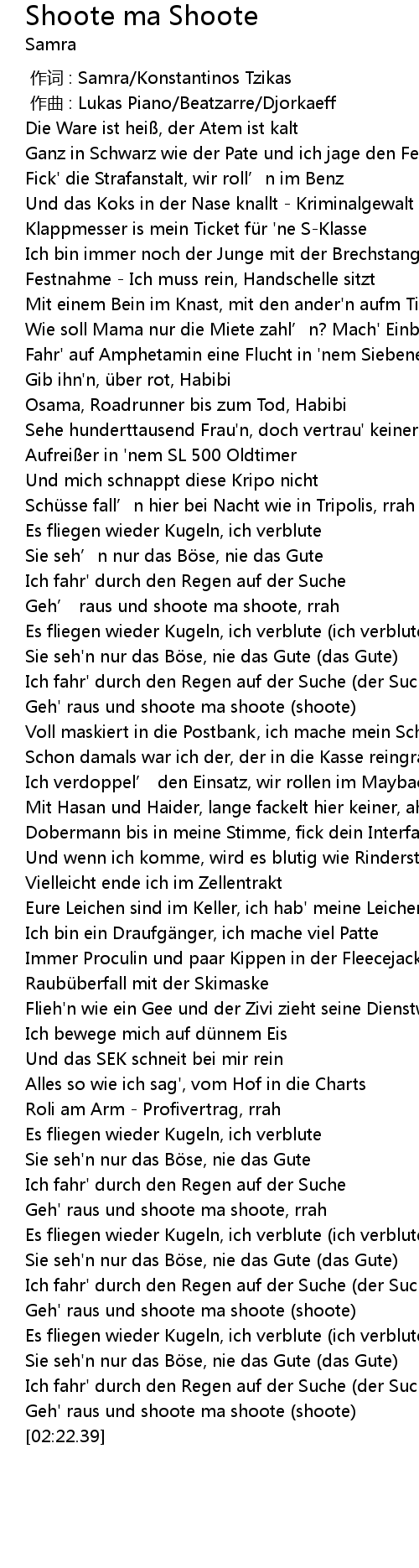 | [02:19.51] | Geh' raus und shoote ma shoote (shoote) |