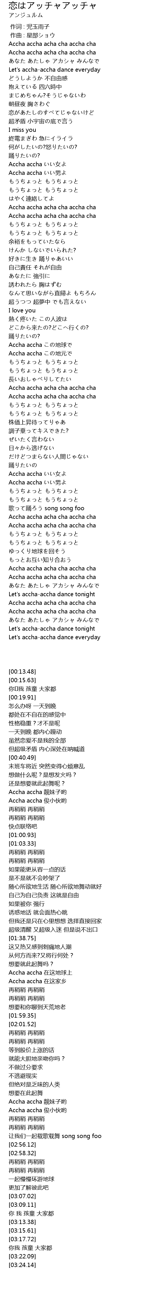 | [03:13.38] | Let's accha-accha dance tonight |