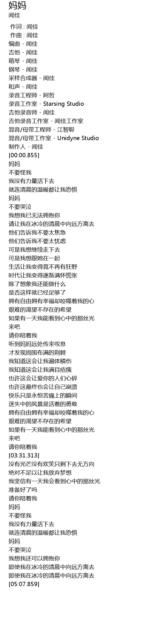 | [02:01.359] | 听到妈妈远处传来叹息 |
