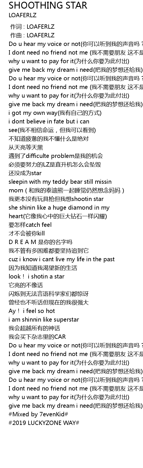| [01:21.614] | wǒ gèng běn méi yǒu wán jù qiāng dàn wǒ xiǎng shootin star |