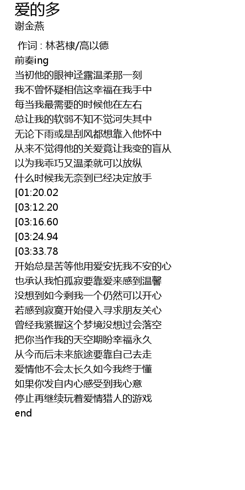 | [04:16.46][03:16.60][01:30.95] | 美丽的爱情故事总会结束总会结束 |
