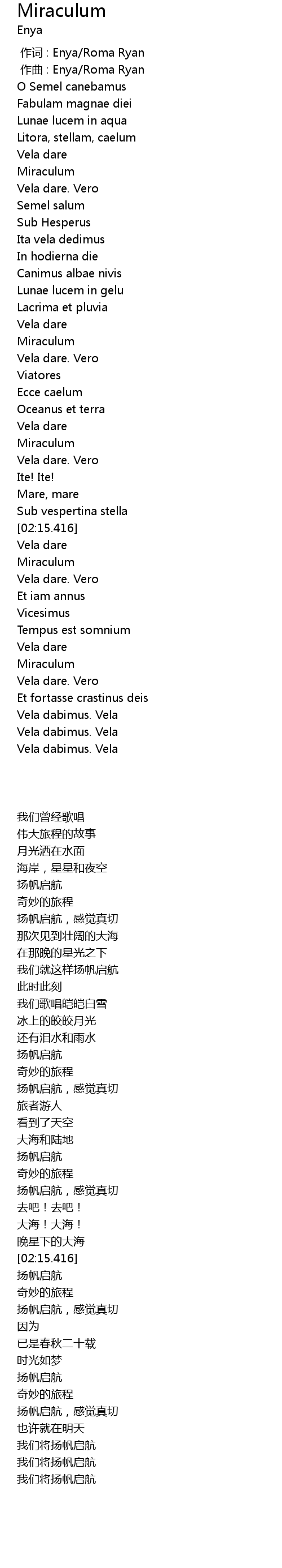 | [00:00.000] | zuo ci : Enya Roma Ryan |