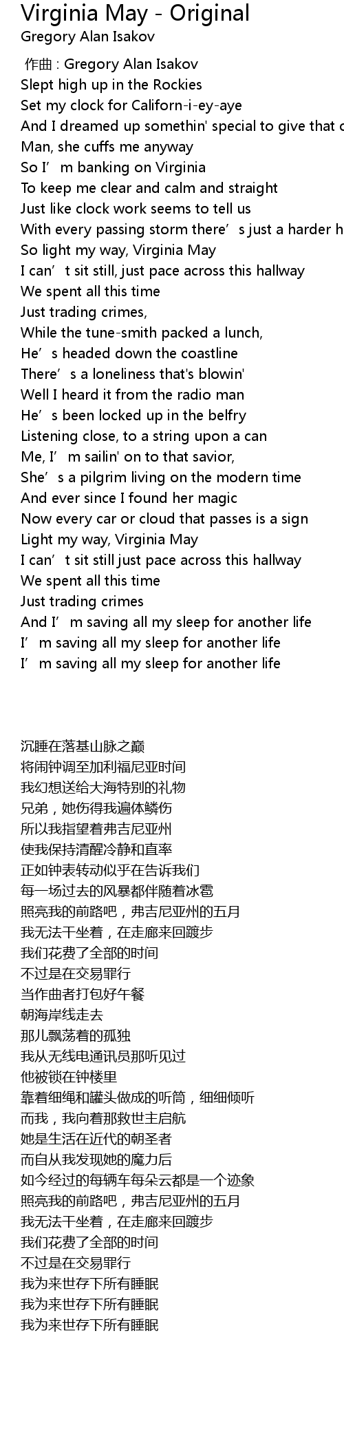 | [02:18.51] | 照亮我的前路吧,弗吉尼亚州的五月 |