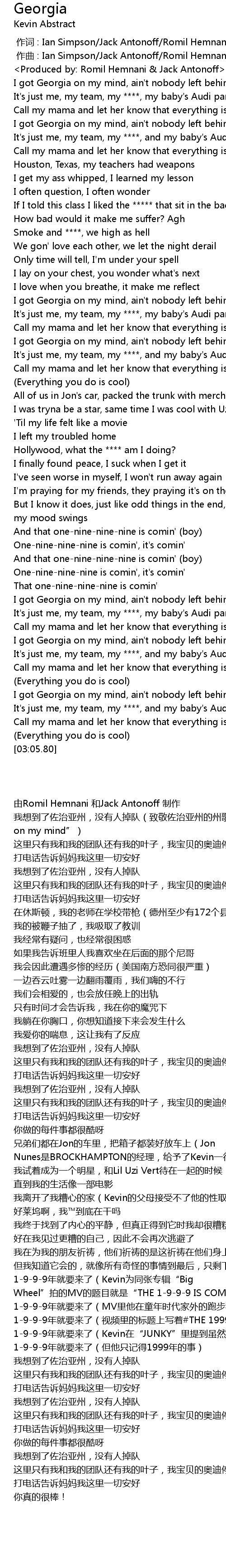 | [00:14.35] | I got Georgia on my mind, ain' t nobody left behind |