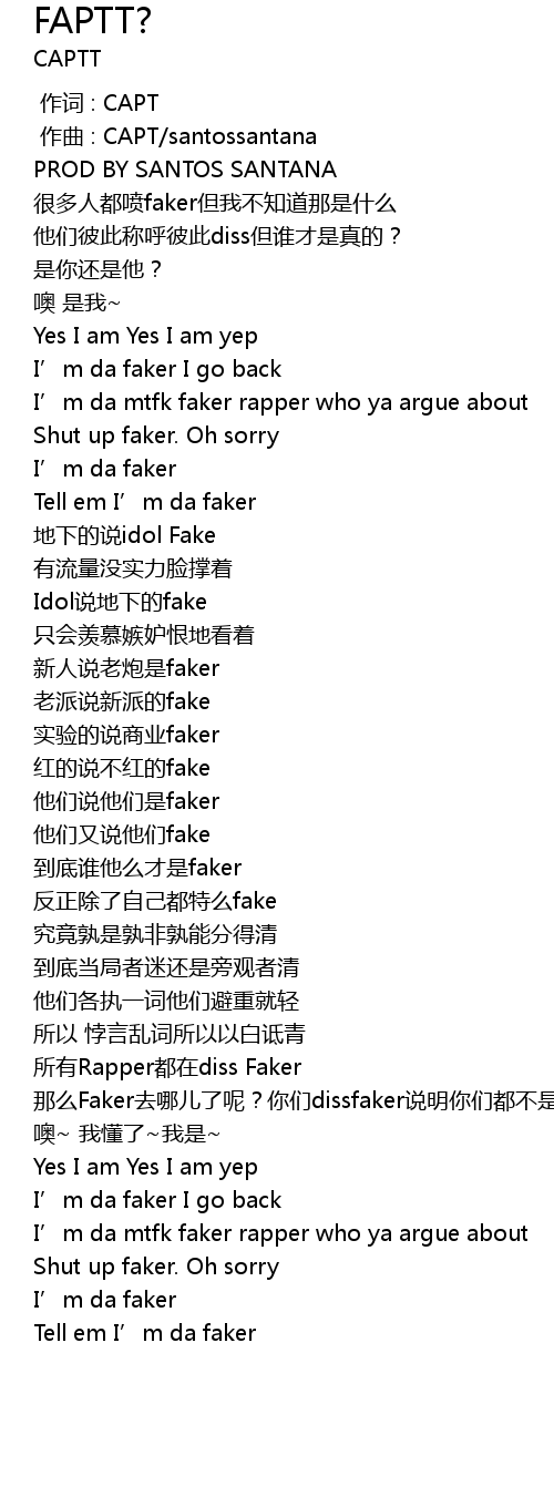 | [01:27.790] | 所有Rapper都在diss Faker 那么Faker去哪儿了呢?你们dissfaker说明你们都不是,那么谁才是Faker |