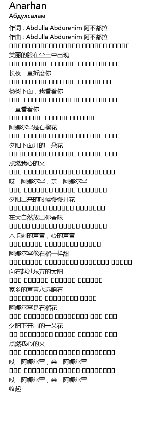 | 作词 : Abdulla Abdurehim 阿不都拉 | |