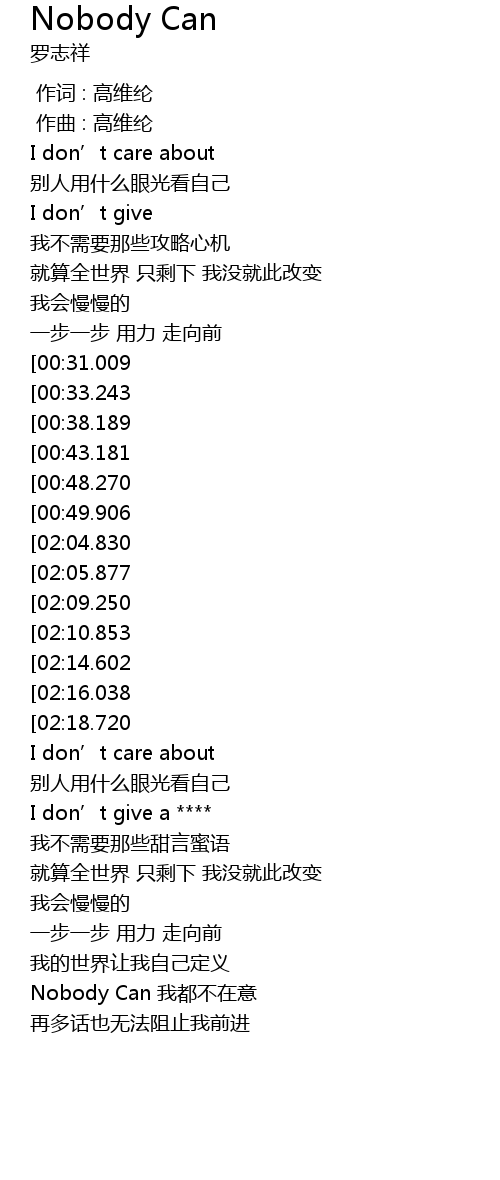 | [02:28.310] | Nobody Can wǒ dōu bù zài yì |