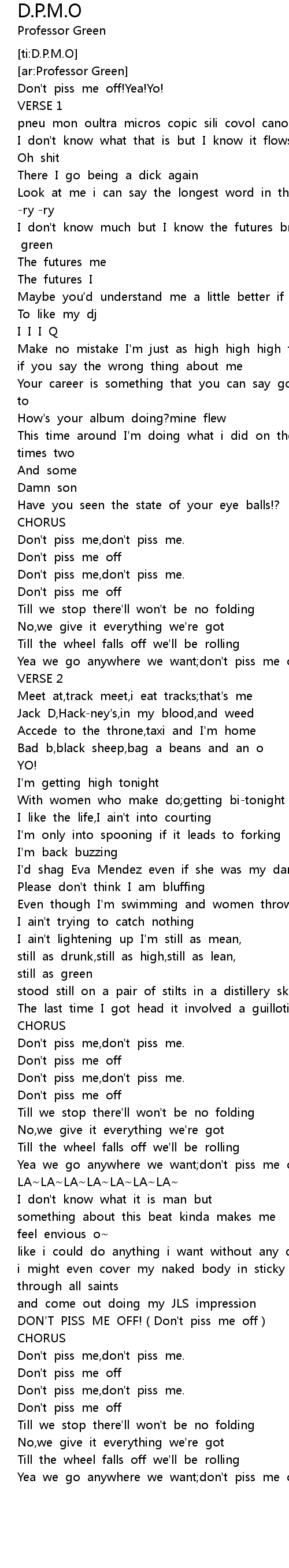 | [01:13.98] | Don' t piss me, don' t piss me. |