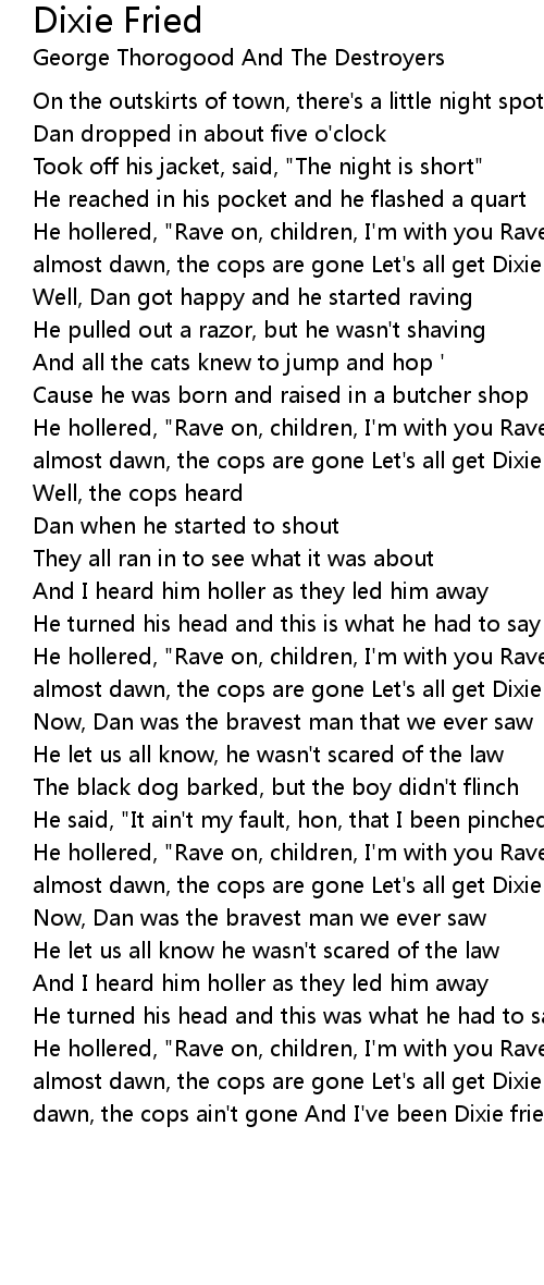 He hollered, "Rave on, children, I'm with you Rave on, cats", he cried "It's almost dawn, the cops are gone Let's all get Dixie fried" "Yeah, it's almost dawn, the cops ain't gone And I've been Dixie fried" |