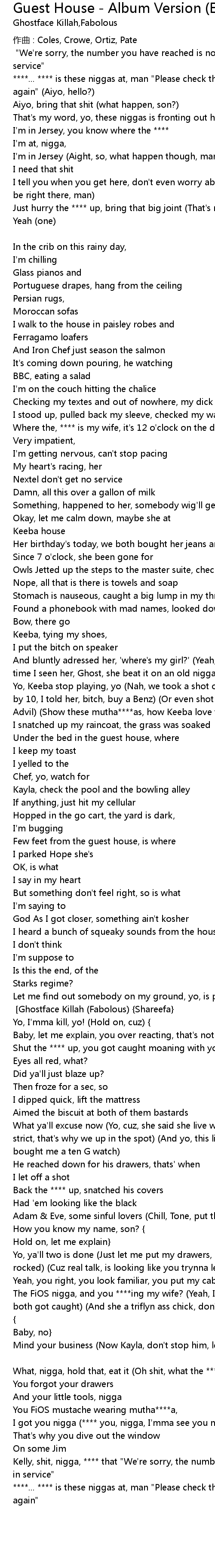 | Let me find out somebody on my ground, yo, is pounding my queen [door slowly opens] [Ghostface Killah (Fabolous) {Shareefa}] | |