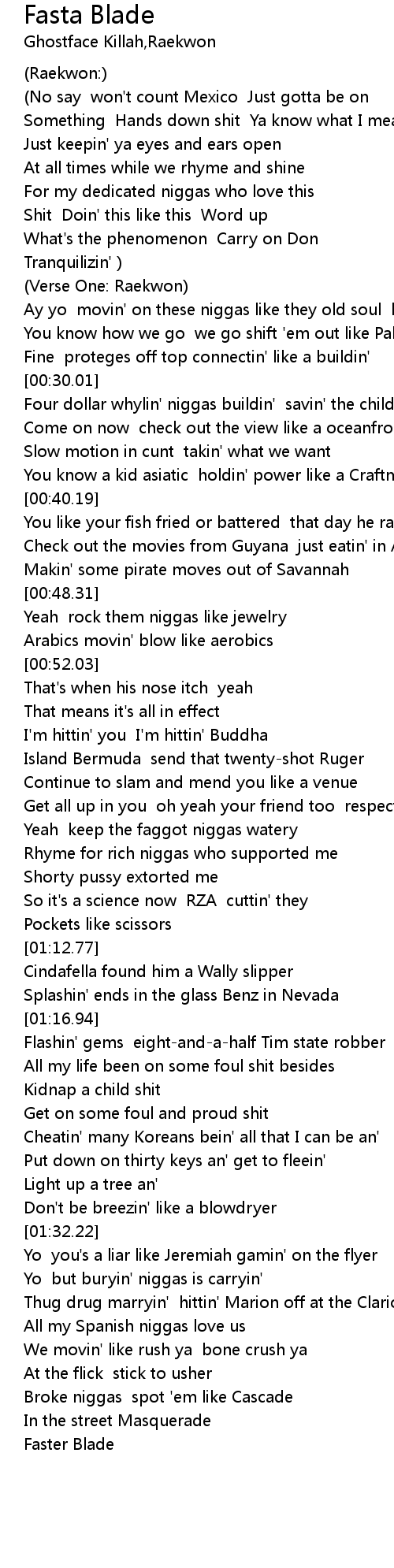 | [01:04.64] | Yeah keep the faggot niggas watery |