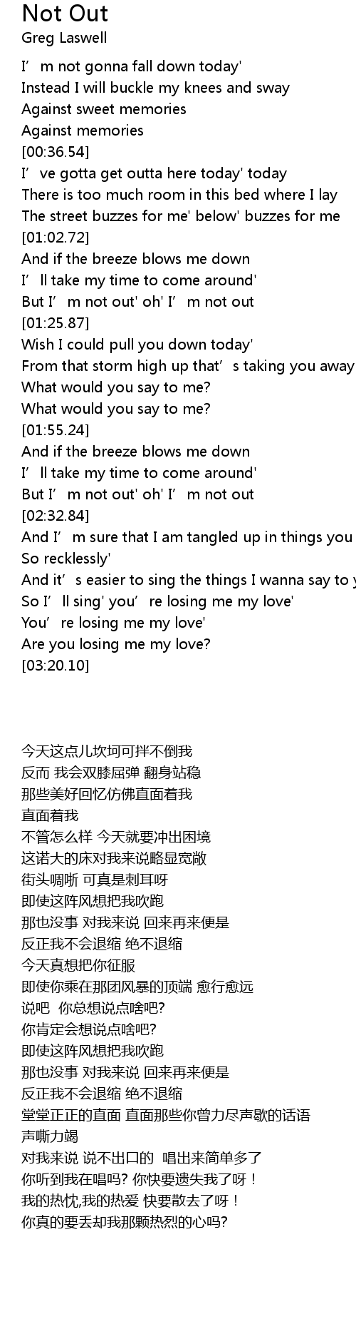 | [01:15.78] | But I' m not out' oh' I' m not out |
