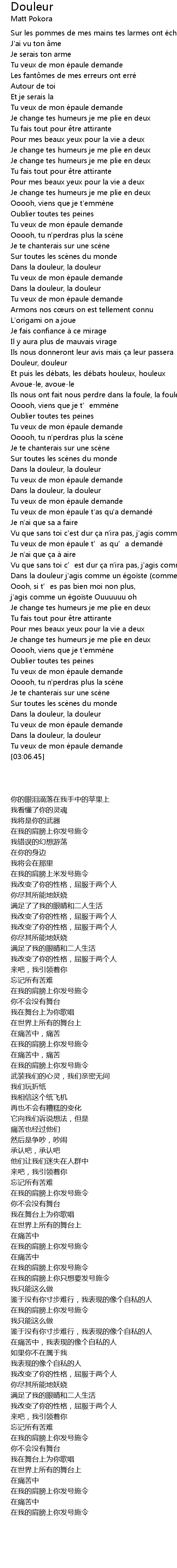 | [00:07.68] | Sur les pommes de mes mains tes larmes ont e choue s |